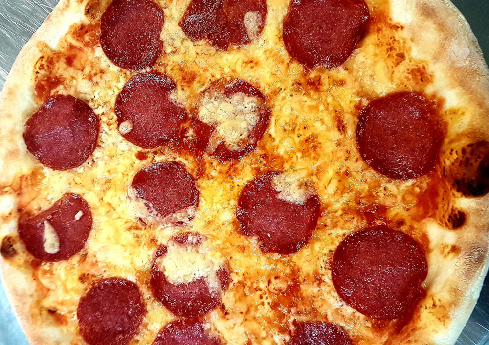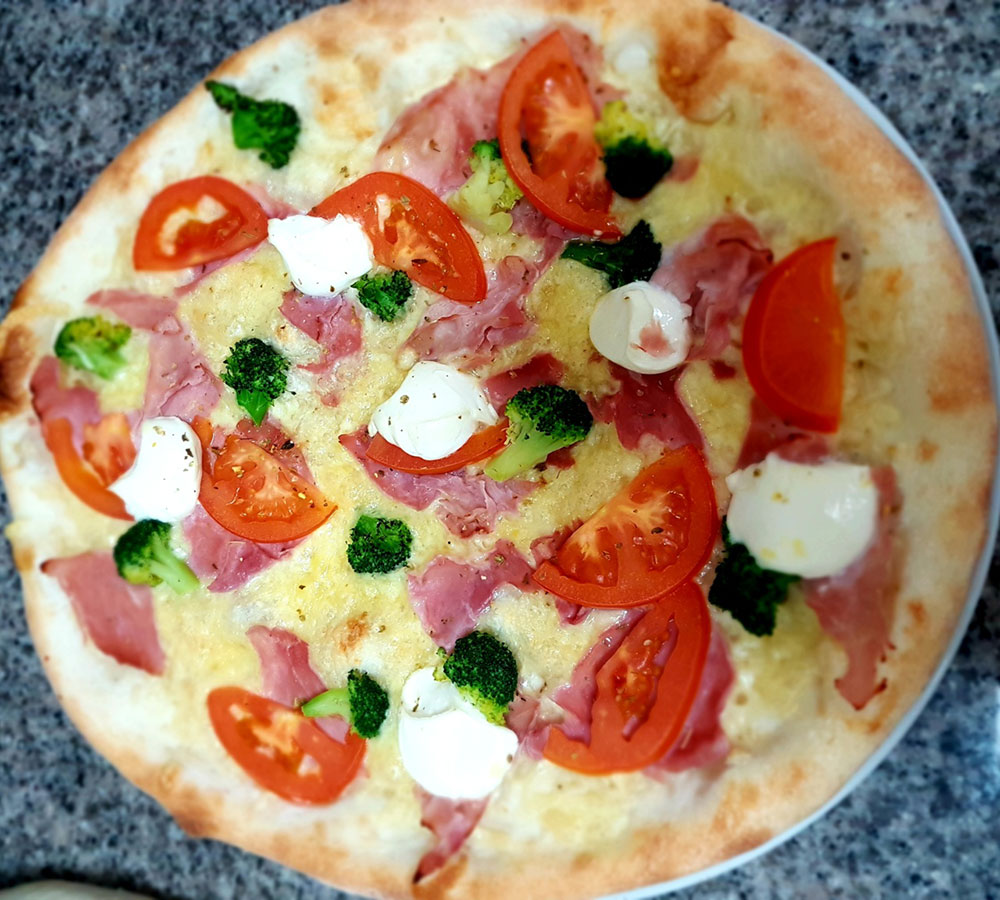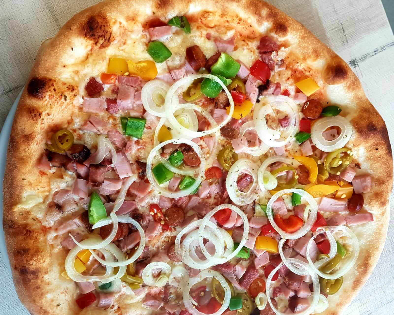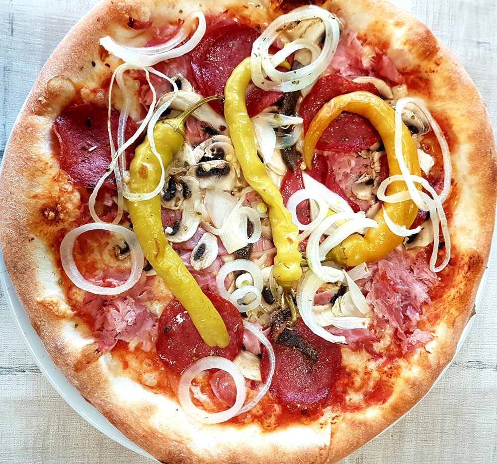 Schinken, Salami, Zwiebel, frische Champignons, Sardellen, Pfefferoni ADG