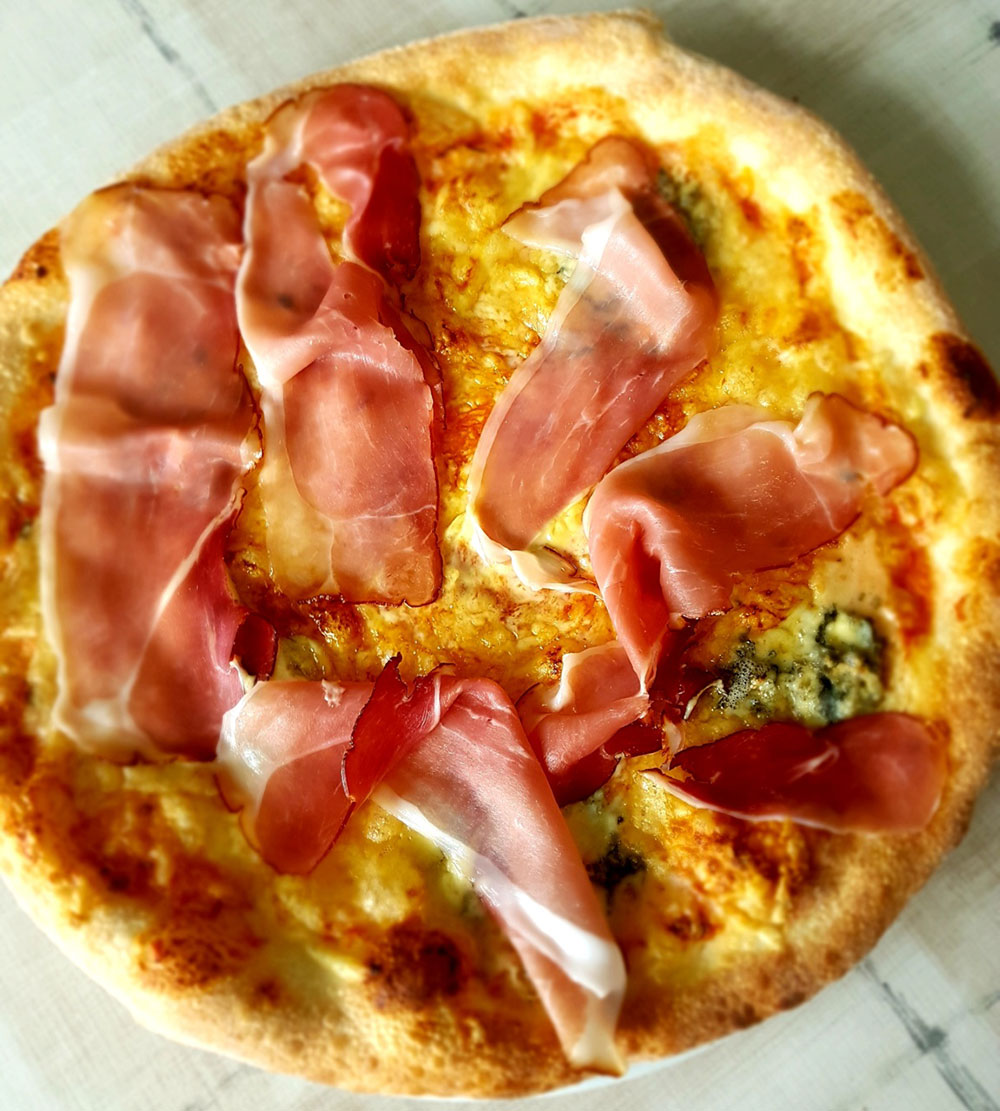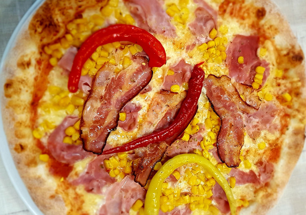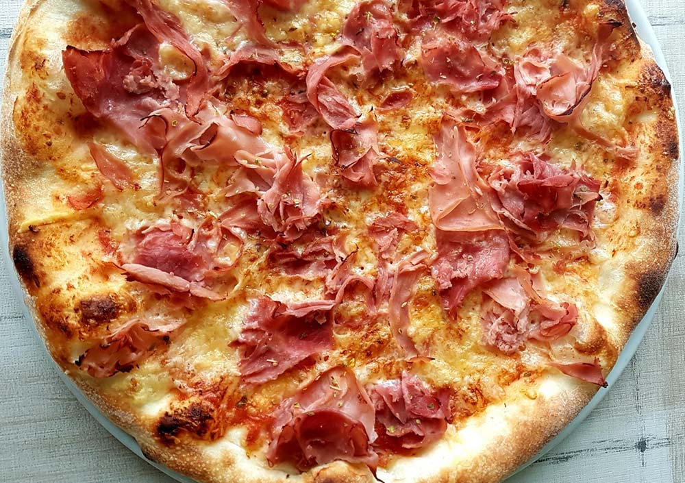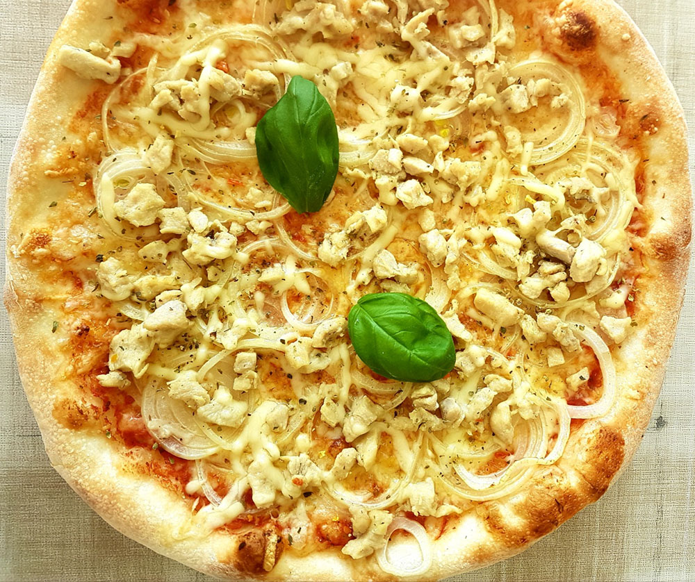 Schinken, Salami, Zwiebel, frische Champignons, Sardellen, Pfefferoni ADG