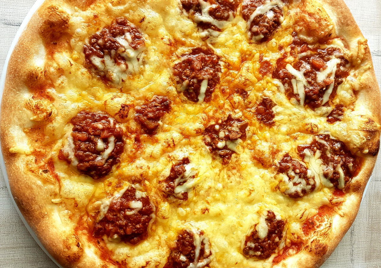 Tomatensauce, Käse, Schinken, Salami, Speck, Knabbernossi, Paprika, Zwiebel, scharfe Pfefferoni klein gehackt AG