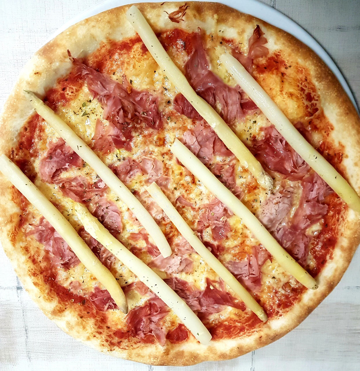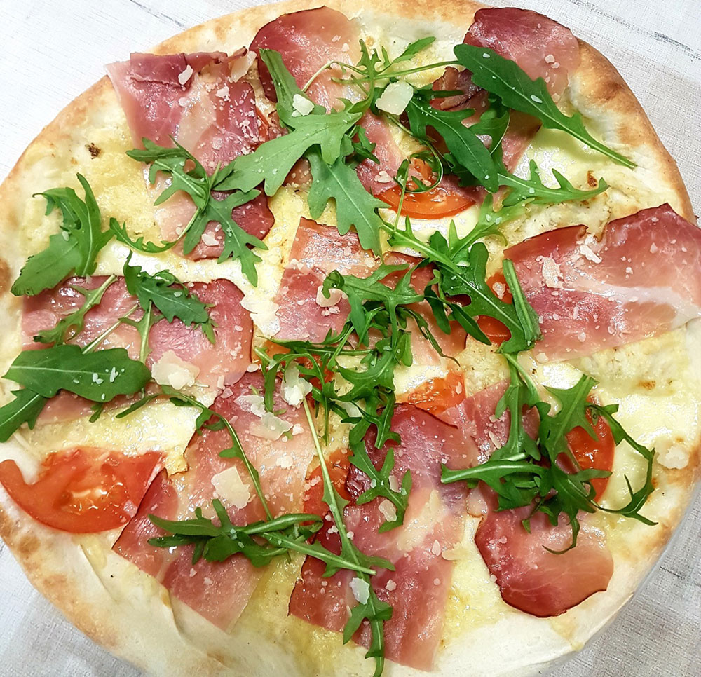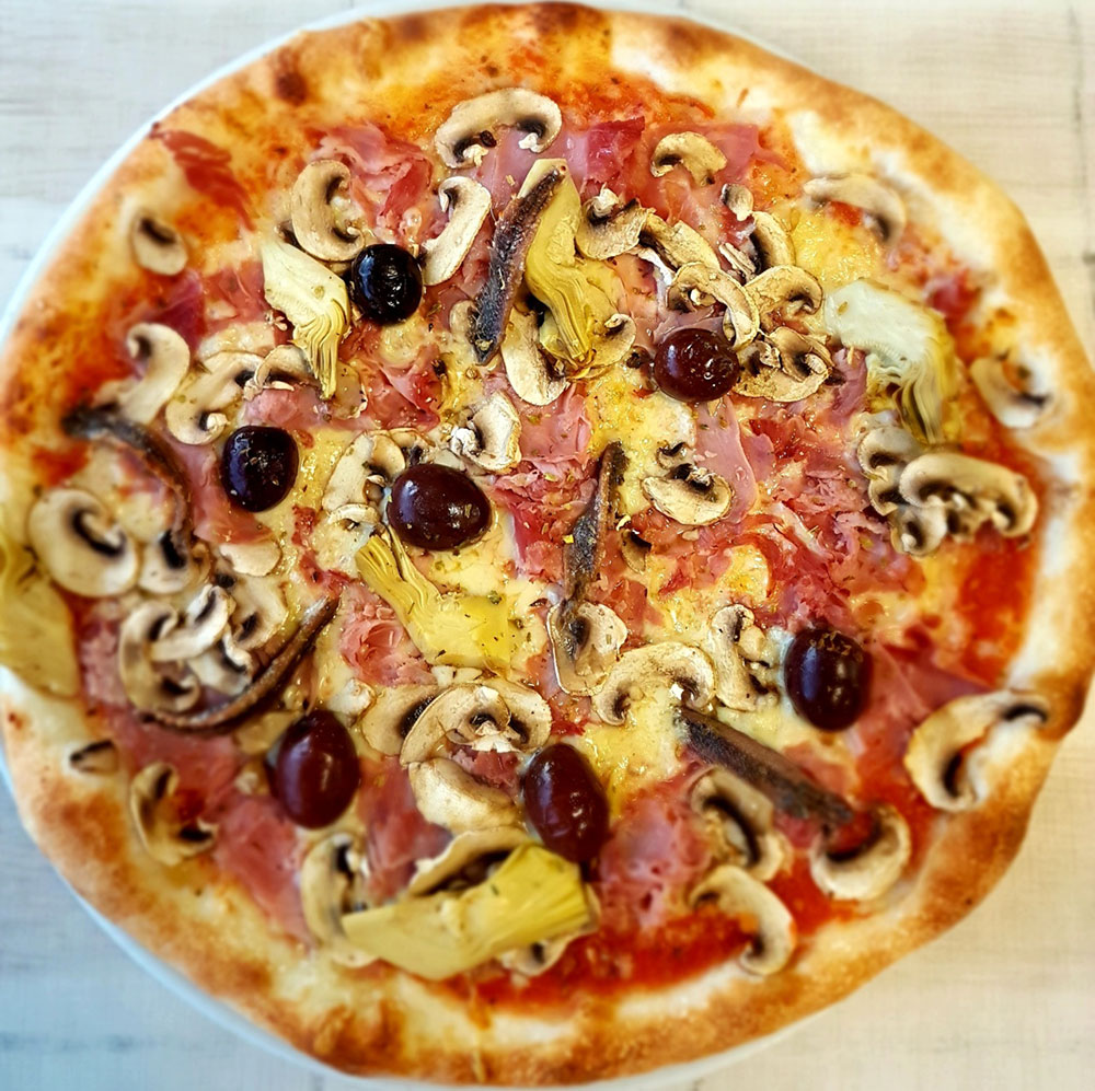 Tomaten, Käse, Schinken, Artischocken, Oliven, frische Champignons, Sardellen ADG