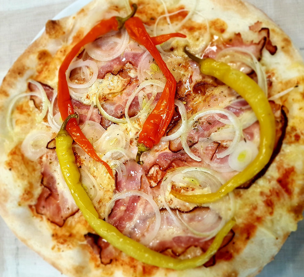 Tomatensauce, Käse,Schinken, Speck, Kapern, Sardellen, scharfe Pfefferoni ADG