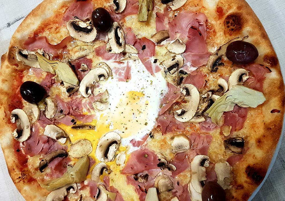 Tomaten, Käse, Schinken, Artischocken, Oliven, frische Champignons, Ei ACG